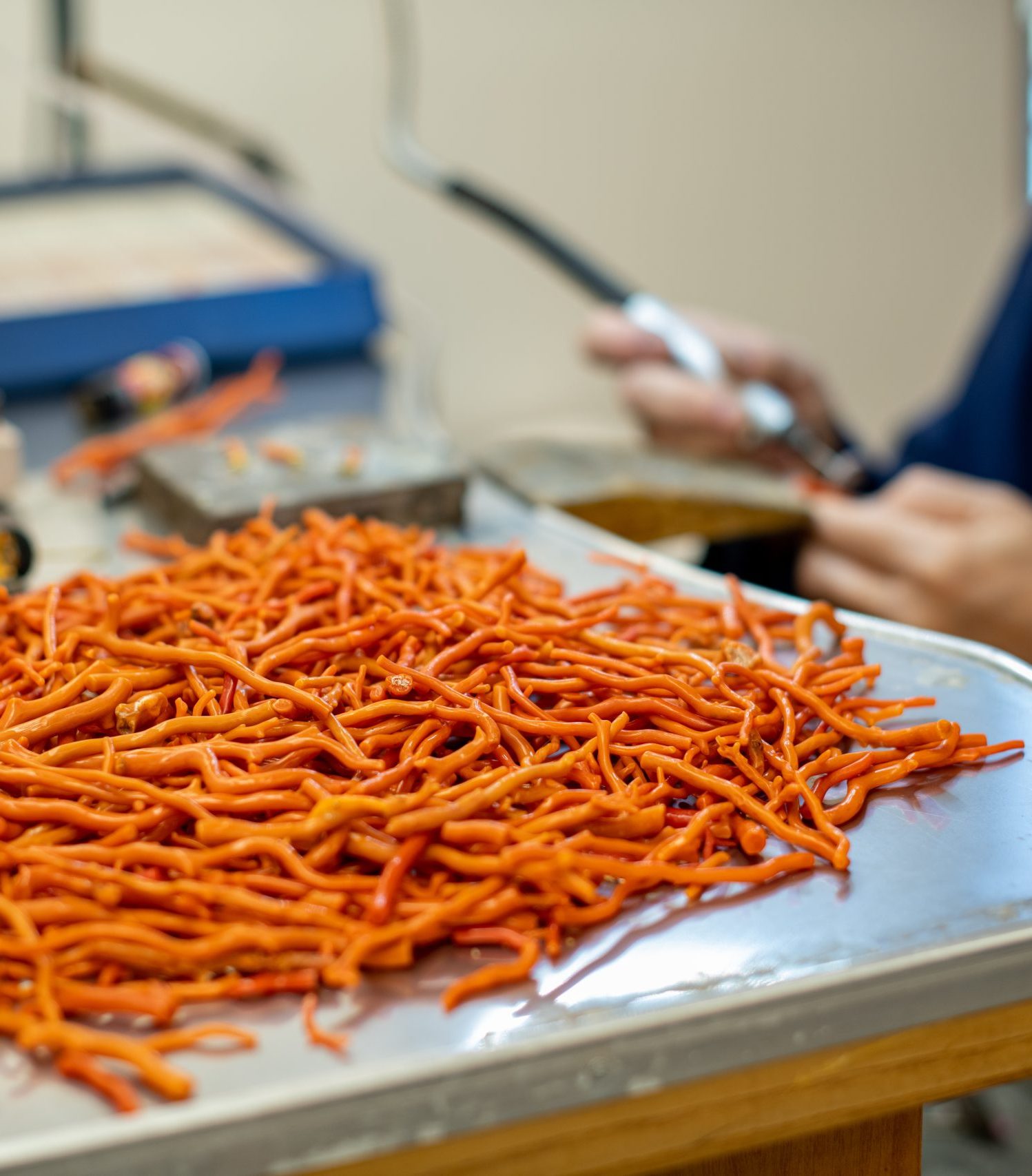 - Il Taglio e la Molatura: Data la natura fragile e preziosa del corallo fossile, il taglio deve seguire le venature naturali per evitare crepe, utilizzando mole ad acqua per preservarne la lucentezza.
