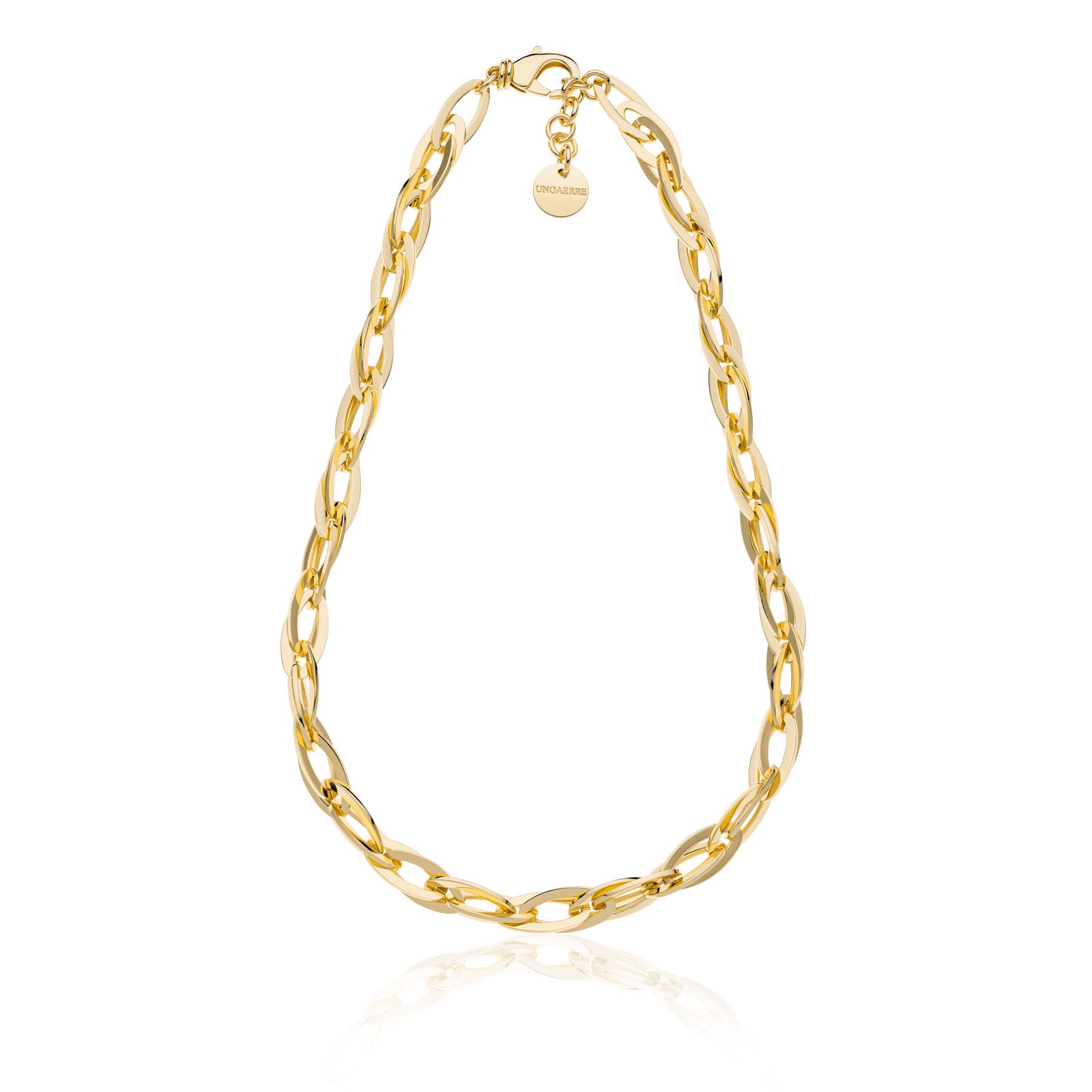 Collana catena a navette concatenata con bagno in oro giallo. Chiusura a moschettone e targhetta con logo. Misura 41,00 cm. Il grande classico della catena forzatina rivisitata in questa audace declinazione a navette concatenata per un susseguirsi unico di stile.